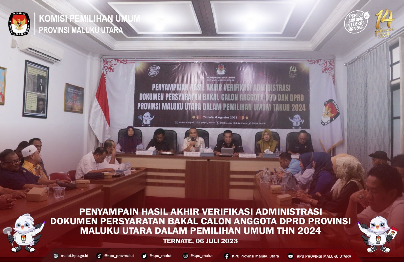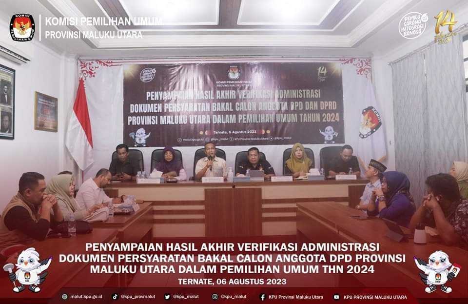 malut.kpu.Ternate-Pengajuan Perbaikan Dokumen Bakal Calon (balon) anggota Dewan Perwakilan Rakyat Daerah (DPRD) Provinsi Maluku Utara (Malut) pada Pemilu tahun 2024, dalam masa Pencermatan Daftar Calon Sementara (DCS) melalui partai politik (parpol) telah tuntas dilaksanakan Komisi Pemilihan Umum (KPU) Malut , 6 sampai 11 Agustu 2023. Ketua KPU Malut, Pudja Sutamat, bersama anggota KPU Malut, Buchari Mahmud, Mohtar Alting, Reni SA. Banjar dan Safrina Rahma Kamaruddin, memulai tahapan ini sejak Minggu, 6 Agustus yang lalu dan merampungkannya sesuai jadwal tahapan, Ju'mat 11 Agustus 2923. Proses penyerahan dokumen perbaikan ini selalu melibatkan Badan Pengawas Pemilu (Bawaslu) provinsi Malut. Kegiatan tahapan selama 1 Minggu ini dipusatkan di kantor sekretariat KPU Malut, di Jalan Anggrek, kawasan Kotabaru, Kota Ternate. Sesuai keputusan rapat pleno verifikasi administrasi (vermin) pada Minggu 6 Agustus 2023, ada 11 partai politik yang tidak memenuhi syarat berkas pengajuan. Untuk Pengajuan Perbaikan Dokumen Persyaratan Bakal Calon Dalam Masa Pencermatan DCS sebanyak 14 parpol yang mengajukan perbaikan, pindah partai, dan dapil. Adapun 14 parpol tersebut antara lain, Partai Kebangkitan Bangsa (PKB), Partai Demokrasi Indonesia Perjuangan (PDIP),, Partai Buruh, Partai Gelora, Partai Keadilan Sejahtera (PKS), Partai Kebangkitan Nusantara (PKN), Partai Hati Nurani Rakyat (Hanura), Partai Garda Republik INdonesia (Garuda), Partai Amanat Nasional (PAN), Partai Bulan Bintang (PBB), Partai Demokrat (PD), Partai Solidaritas Indoneaia (PSI), Partai Persatuan Pembangunan (PPP), dan Partai Ummat. Kini, KPU Malut sementara melaksanakan tahapan vermin dokumen Persyaratan Bakal Calon pasca pencermatan rancangan Daftar Calon Sementara (DCS) sejak Sabtu 12 Agustus. Tahapan ini akan berakhir pada Ahad, 15 Agustus 2023 yang akan datang. (ZD)