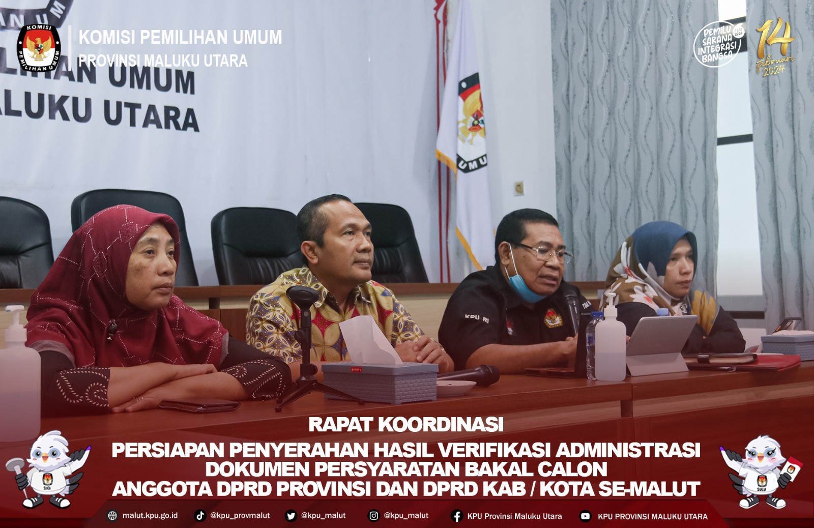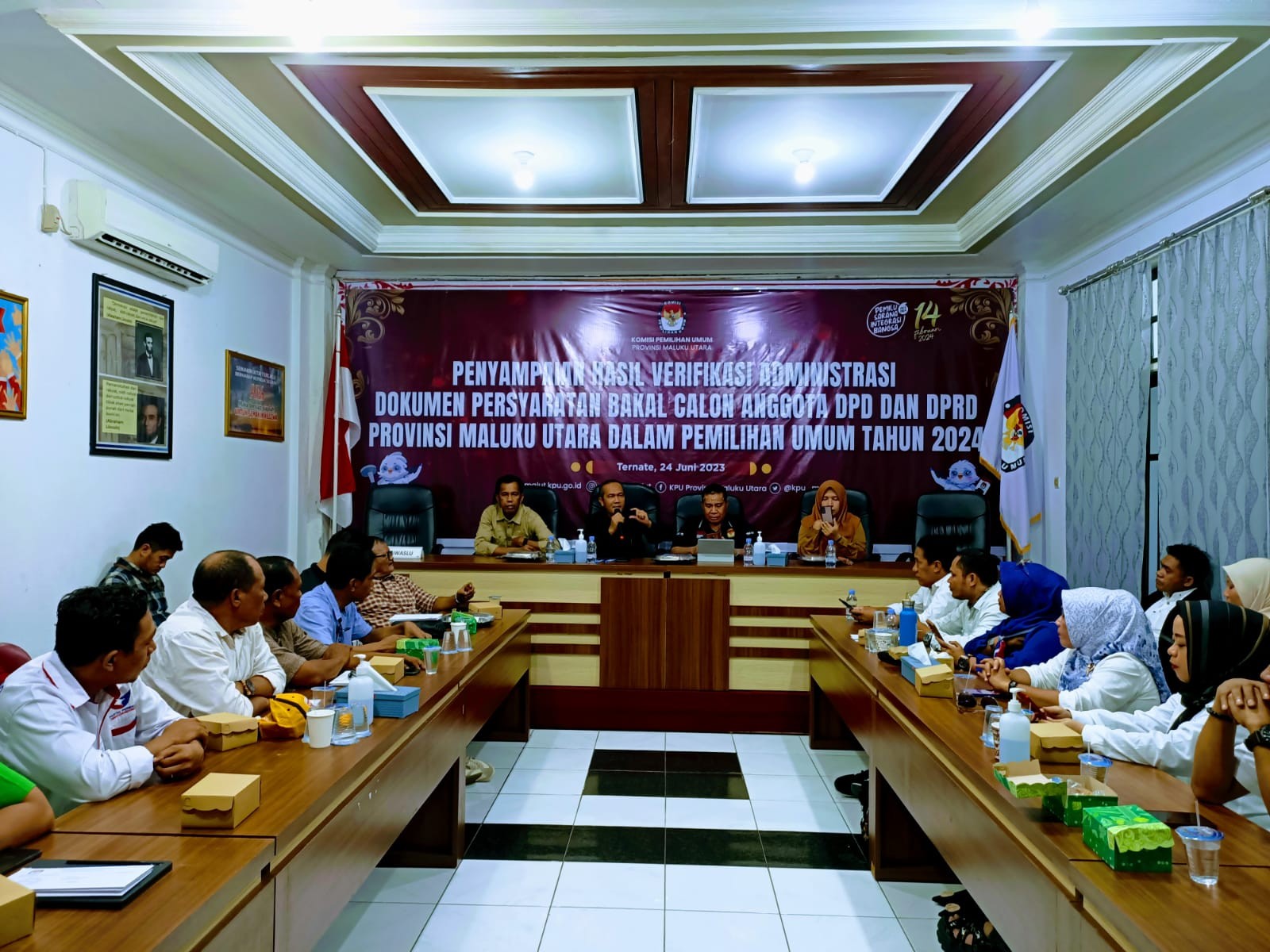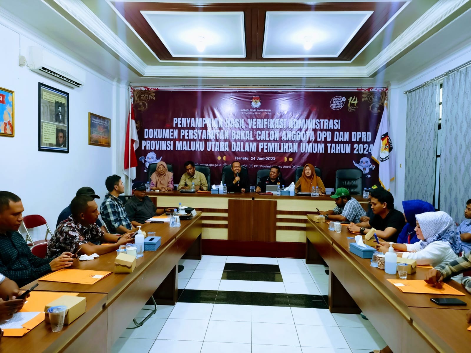 malut .kpu. go.id ,-Ternate. Ketua Komisi Pemilihan Umum (KPU) Maluku Utara (Malut), Pudja Sutamat, bersama anggota KPU Malut, Buchari Mahmud, Mohtar Alting, Reni SA Banjar, dan Safrina Rahma Kamaruddin, menggelar kegiatan penyampaian hasil verifikasi administrasi (vermin) syarat bakal calon (balon) anggota DPRD provinsi di Sekretariat KPU Malut, di Jalan Anggrek, kawasan Kotabaru, Kota Ternate, Sabtu (24/6).