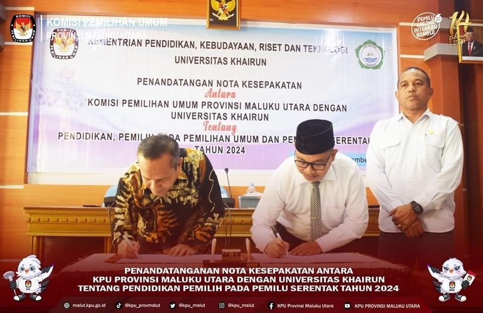 malut.kpu.go.id-Ternate.Komisi Pemilihan Umum (KPU) Provinsi Maluku Utara, (Malut) resmi menjalin kerja sama dengan Kementerian Pendidikan Kebudayaan, Riset dan Tekhnologi Universitas Khairun (Unkhair) Ternate, Senin (11/12/2023), di ruang Senat Unkhair Ternate. Penandatanganan Nota Kesepahaman dengan KPU Malut, melakukan kerjasama terkait Pendidikan Pemilih pada Pemilihan Umum dan Pemilihan Serentak Tahun 2024, dilakukan langsung Ketua KPU Malut Pudja Sutamat  bersama Rektor Unkhair DR. Ridha Ajam M.Hum. Pudja menyambut baik kerja sama ini dan meyakini akan adanya efek positif dalam penyebarluasan informasi  kepada  lingkungan kampus bagi pemilih muda tentang kepemiluan dan mendukung terwujudnya peningkatan partisipasi pemilih pada pemilu 2024 dengan tujuan bersama untuk menyukseskan Pemilu dan Pemilihan Kepala Daerah tahun 2024.  Turut menyaksikan jalannya penandatanganan Perjanjian Kerjasama ini, anggota KPU Malut Buchari Mahmud, Reni SA. Banjar dan Safrina Rahma Kamaruddin serta Kabag Perencanaan Data dan Informasi Nuryani Abdullah, Kasubbag Perencanaan Mohammad Bachtiar dan Kasubbag Tekpar Hubmas KPU Malut  Fadli Muhammad, beserta seluruh  pejabat dilingkungan Unkhair Ternate.(ZD)