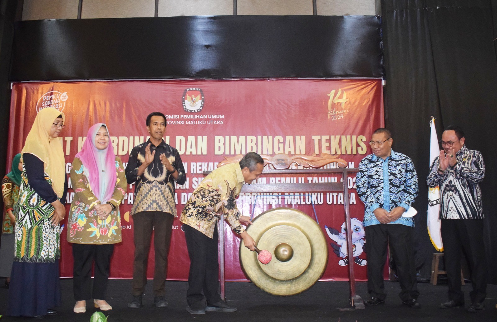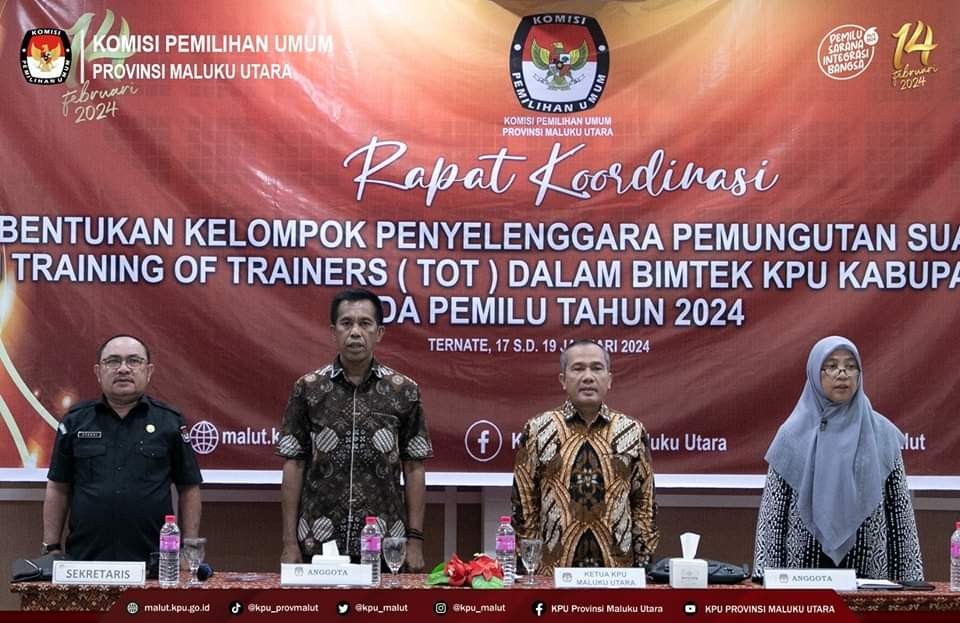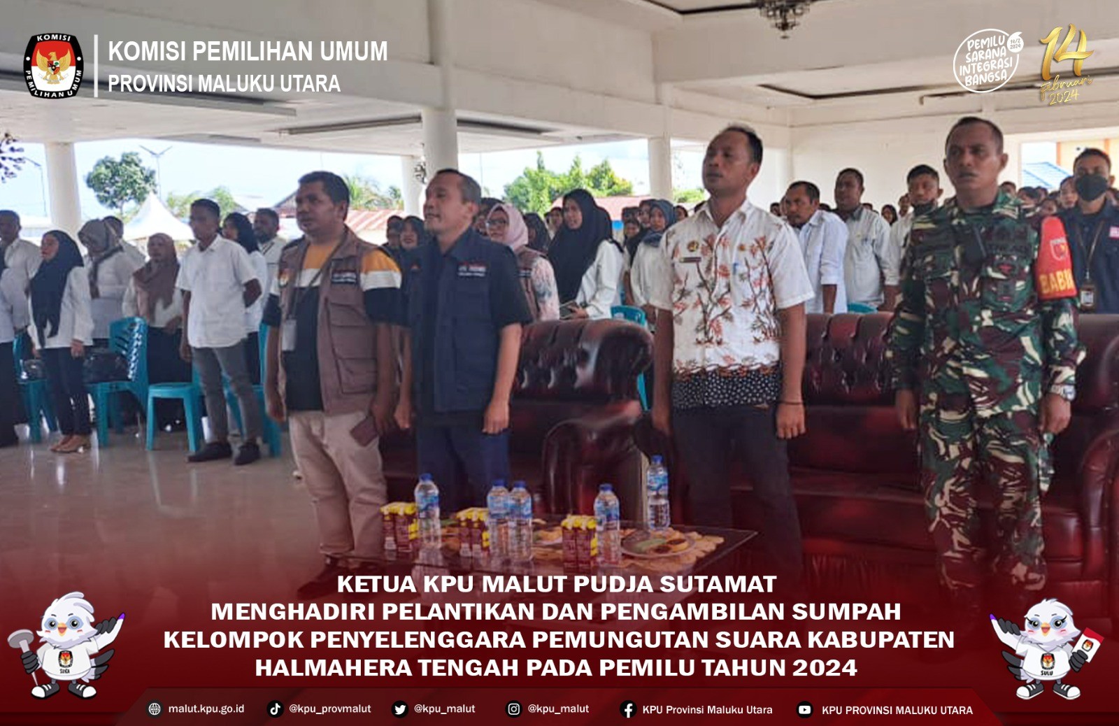 malut.kpu.go.id -Ternate, Pelantikan sekaligus pengambilan sumpah terhadap Kelompok Penyelenggara Pemungutan Suara (KPPS) untuk Pemilihan Umum Tahun 2024, yang dipusatkan di Desa Fidi Jaya, Kecamatan Weda Tengah, Kabupaten Halmahera Tengah Kamis (25/1/2024). Ketua KPU Malut Pudja Sutamat menyampikan harapannya saat memberikan sambutan, kepada 2037 anggota KPPS yang hadir secara terpisah, agar selalu menjaga integritas dan kredibilitasnya. “Bekerja dengan sebaik-baiknya sesuai aturan dengan tujuan menciptakan pemilu yang sukses aman dan damai,” ujarnya. Kegiatan ini diakhiri dengan penanaman pohon di Taman Kota secara simbolis oleh Pudja Sutamat yang di dampingi ketua dan anggota KPU beserta seluruh jajaran sekretariat KPU Halteng. Gerakan penanaman pohon adalah program KPU RI dalam rangka menghijaukan bumi secara serentak di seluruh Indonesia dalam momentum pelantikan anggota KPPS. Rangkaian kegiatan ini di monitor langsung oleh pimpinan KPU RI melalui live report meeting zoom.(ZD)