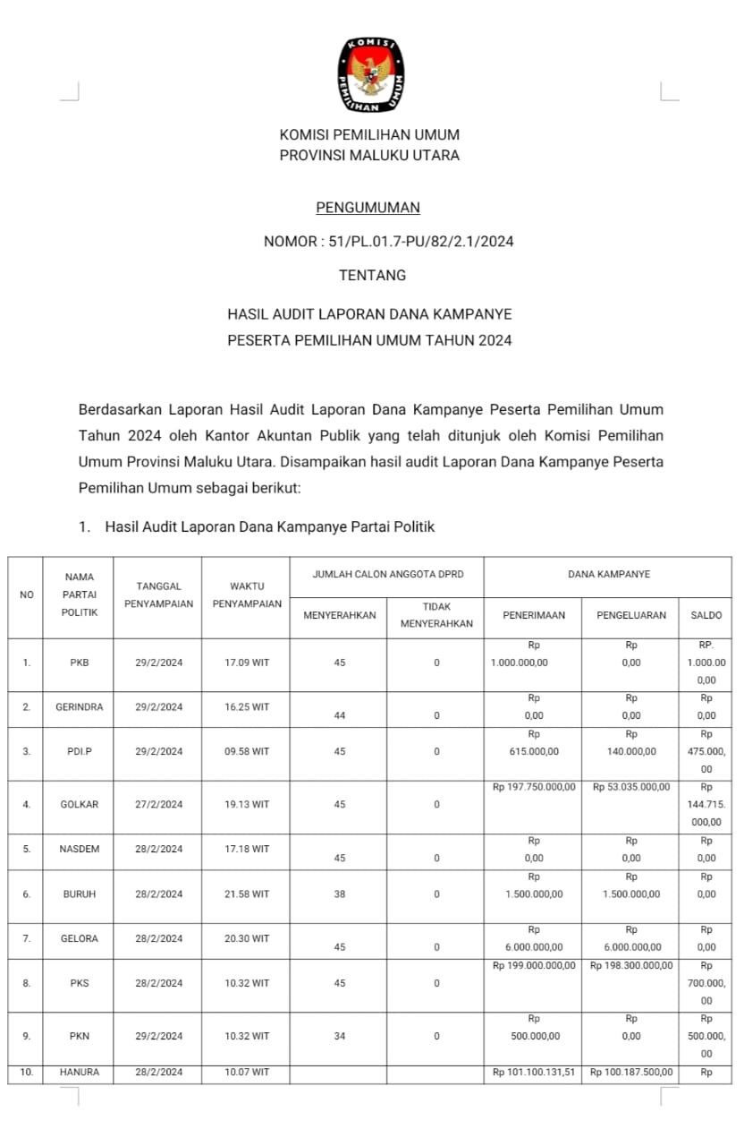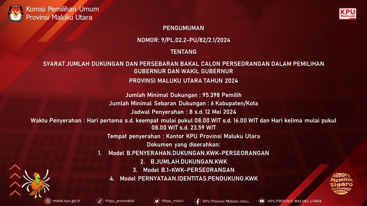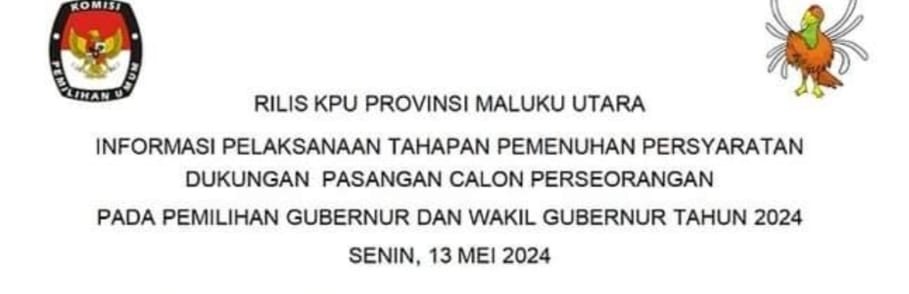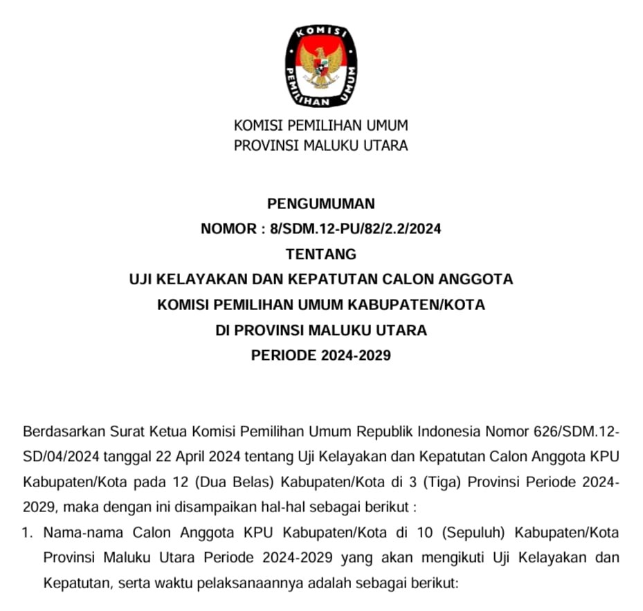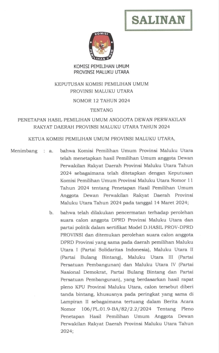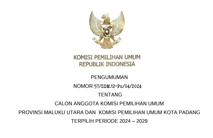 Keputusan Komisi Pemilihan Umum Provinsi Maluku Utara Nomor 12 Tahun 2024 Tentang Penetapan Hasil Pemilihan Umum Anggota Dewan Perwakilan Daerah Provinsi Maluku Utara Tahun 2024, sejak berlakunya Keputusan ini, maka Keputusan Nomor 11 Tahun 2024 dicabut dan dinyatakan tidak berlaku lagi, Informasi selengkapnya KLIK DISINI