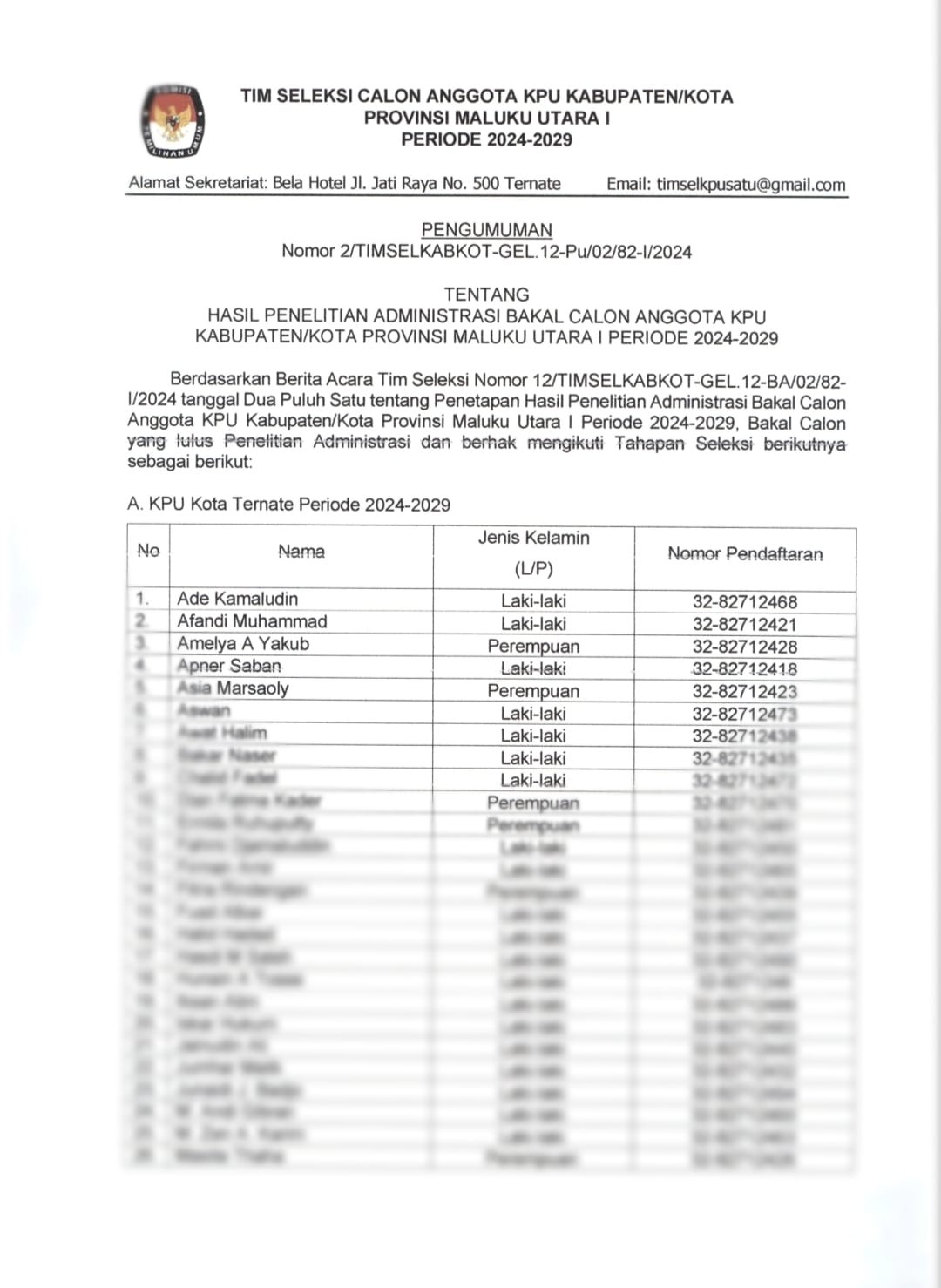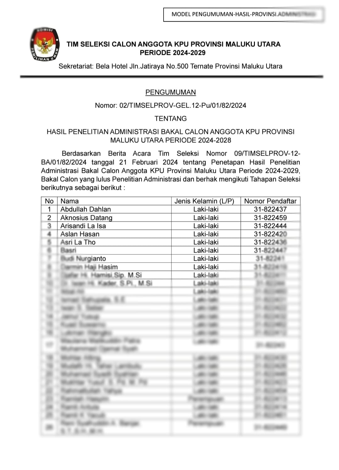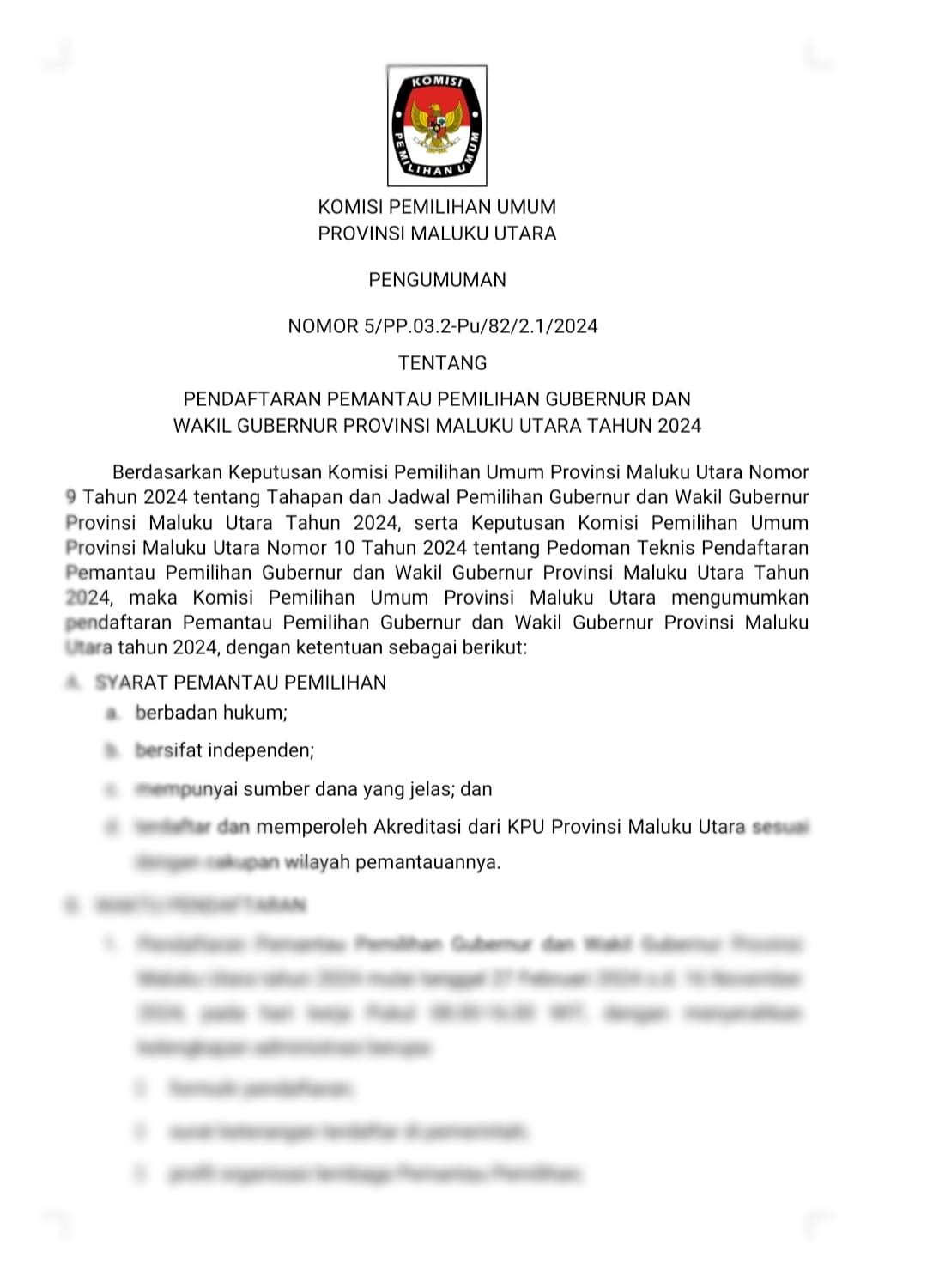 Berdasarkan Keputusan Komisi Pemilihan Umum Provinsi Maluku Utara Nomor 9 Tahun 2024 tentang Tahapan dan Jadwal Pemilihan Gubernur dan Wakil Gubernur Provinsi Maluku Utara Tahun 2024, serta Keputusan Komisi Pemilihan Umum Provinsi Maluku Utara Nomor 10 Tahun 2024 tentang Pedoman Teknis Pendaftaran Pemantau Pemilihan Gubernur dan Wakil Gubernur Provinsi Maluku Utara Tahun 2024, maka Komisi Pemilihan Umum Provinsi Maluku Utara mengumumkan pendaftaran Pemantau Pemilihan Gubernur dan Wakil Gubernur Provinsi Maluku Utara tahun 2024, Informasi Selengkapnya KLIK DISINI